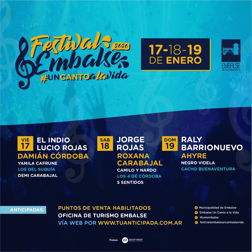 Embalse de Calamuchita: Esta ciudad del Valle de Calamuchita se prepara para una nueva edición del Festival Embalse Un Canto a la Vida 2020 los días viernes 17, sábado 18 y domingo 19 de enero, en el predio de la Parroquia Nuestra Sra. de Loreto. La 35º edición ofrecerá al público una grilla con los mejores artistas del momento.