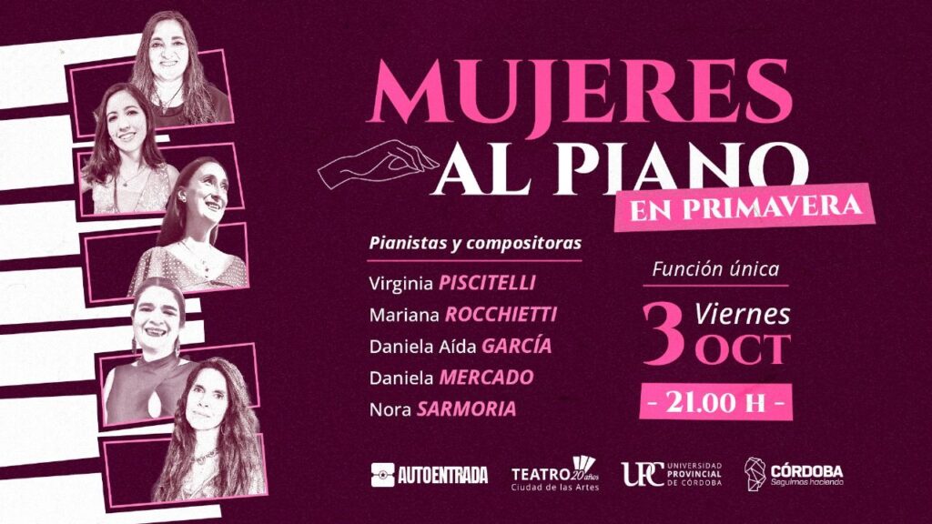 Luego de su existoso paso por el Teatro del Libertador San Martín a principio de año, Mujeres al Piano anunció su regreso en primavera con una edición que reunirá a cinco pianistas argentinas: Daniela Mercado, Nora Sarmoria, Virginia Piscitelli, Daniela García y Mariana Rocchietti. Será este viernes 3 de octubre, a las 21 horas, en el Teatro Ciudad de las Artes.